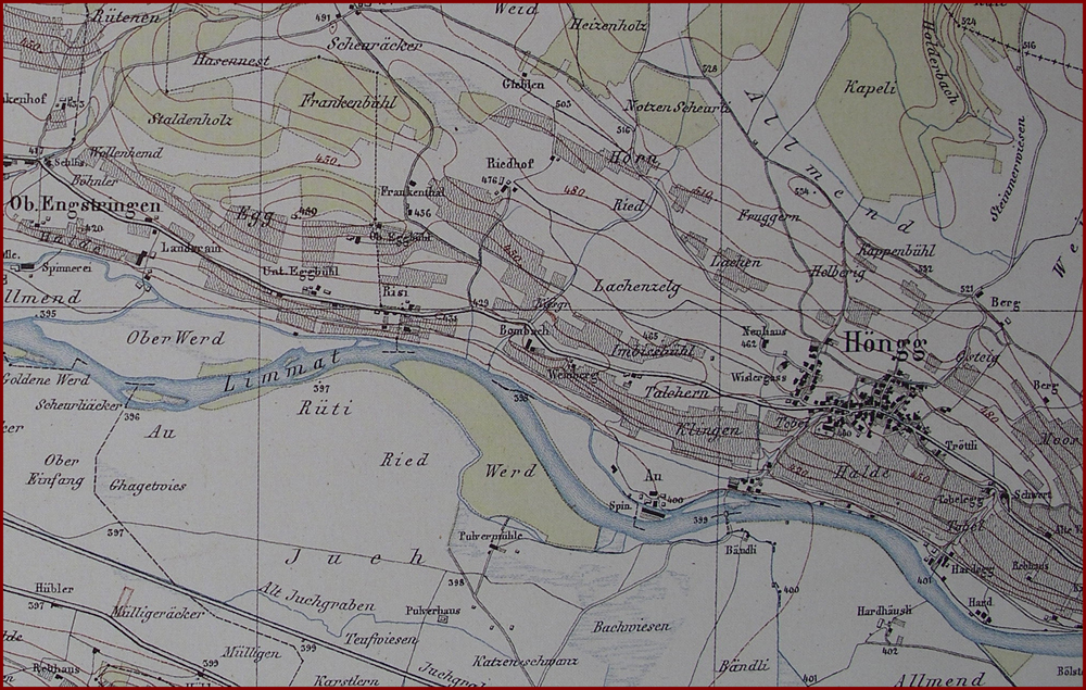 Der Druck der Dufour-Karte erfolgte einfarbig als Kupferstich. Mit Schraffen, die im Gebirge durch klare Felszeichnung ergänzt wurden, und durch Nordwestbeleuchtung erzielte Dufour eine eindrückliche Reliefwirkung. Die schwarzen Schraffen füllten aber das Kartenbild, und die Reduktion der Vorlage vom Massstab 1:25 000 auf 1:100 000 liess zudem ur wenig Platz für Details. Das Topografische Bureau in Zü,rich, Vorgänger des Kantonalen Vermessungsamts, entschloss sich, Wilds Originalblätter überarbeiten zu lassen und in Stein zu gravieren. die nun entstehende Wild-Karte ist reich an Ortsnamen, klarer in den Einzelheiten und enthält auch die seit der Kartenaufnahme neu gebauten Eisenbahnlinien. Im Steindruck konnten zudem farbibe Flächen gedruckt werden. Es brauchte vier Lithografiesteine je für die Farben Schwarz, Blau, Grün und Braun. Der Hellgrüne Waldton gibt den Kartenblättern ein freundliches Aussehen.
